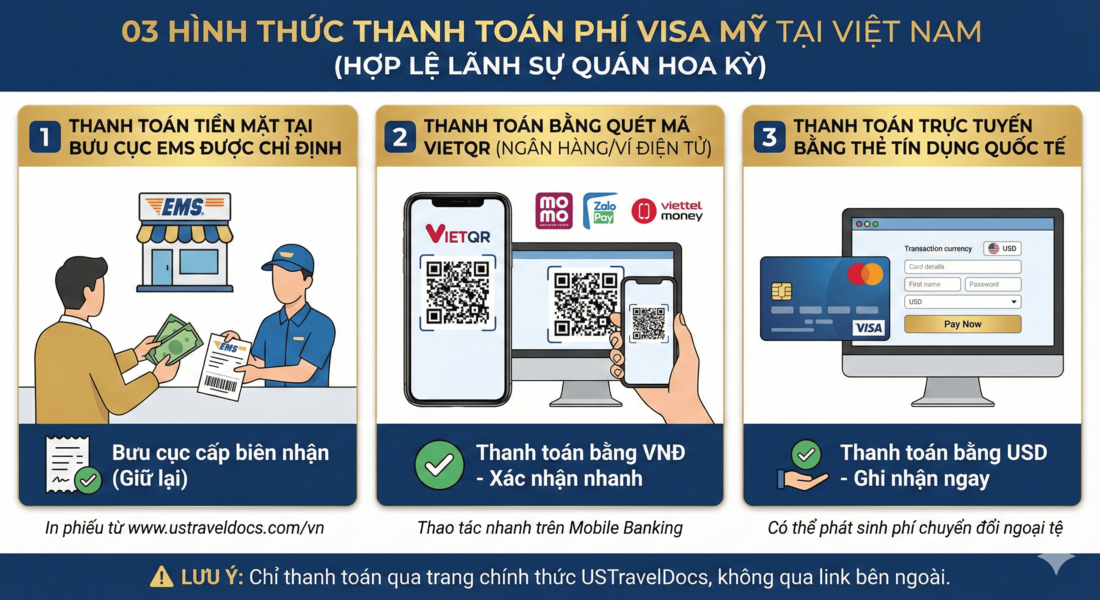 Tại Việt Nam, có 03 hình thức thanh toán hợp lệ được Lãnh sự quán Hoa Kỳ chấp thuận: